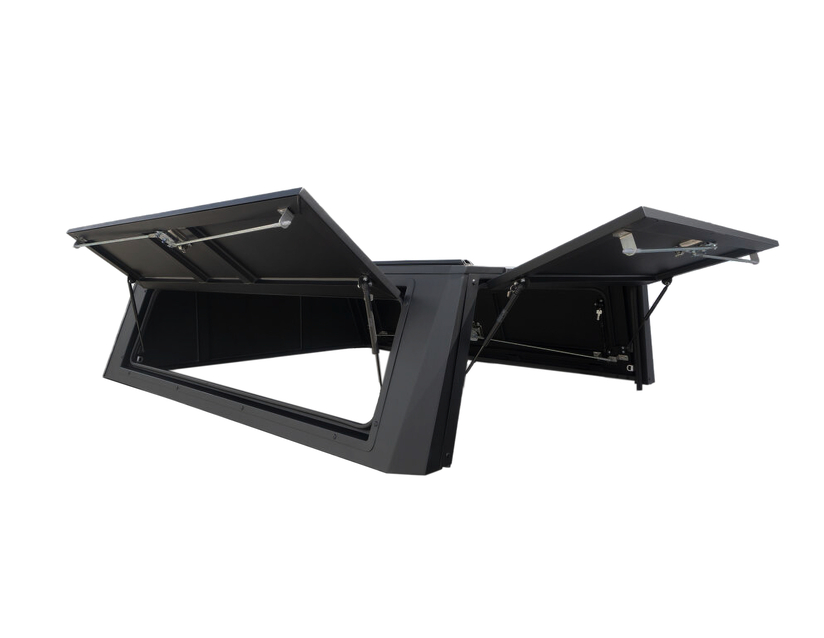 Robust aluminium hard top with 2 aluminium side doors and an aluminium rear door. Each door is held in the open position with gas struts, giving you easy all-round access to the load bed.